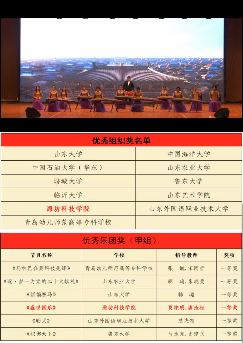 日前,由山东省教育厅主办的2022年山东省大学生校园艺术节器乐专项展示活动评选结果公示,我校选送的器乐合奏《盛世国乐》荣获优秀乐团奖(甲组)一等奖,学校荣获“优秀组织奖”。