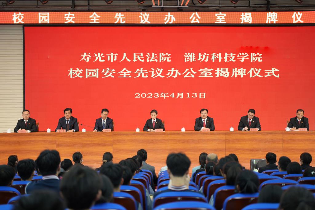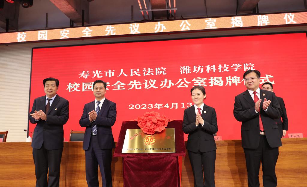 4月13日,校园安全先议办公室揭牌仪式在潍坊科技学院报告厅举行。仪式由寿光法院党组书记、院长王永涛主持,寿光市委常委、政法委书记李增国致辞,山东省高院刑一庭副庭长、三级高级法官罗莹参加仪式并讲话。山东省高院刑一庭副庭长、三级高级法官罗莹,潍坊中院党组成员、副院长孙绍军,寿光市委常委、政法委书记李增国,潍坊科技学院党委委员、副校长李广伟共同为校园安全先议办公室揭牌,潍坊中院审委会委员、未审庭庭长宋宗明,寿光法院审委会专职委员王世山,省高院、潍坊中院及部分县市区法院分管负责同志,潍坊科技学院师生代表等参加揭牌仪式。