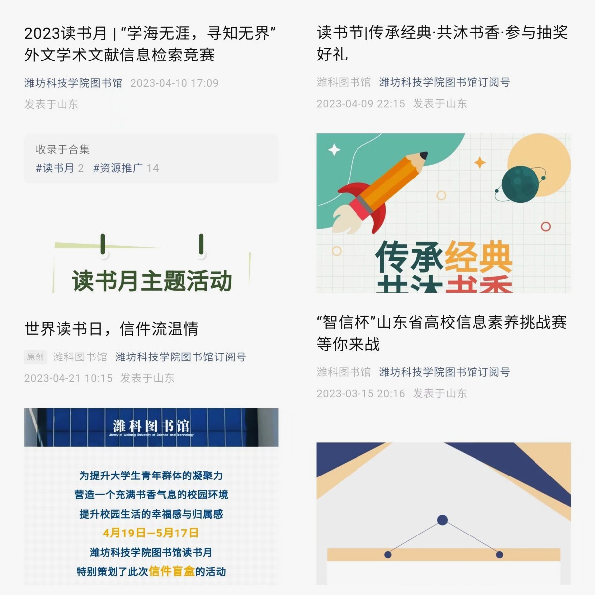 恰逢第28个世界读书日到来之际,为进一步丰富校园文化生活,营造浓郁读书氛围,激发师生读书热情,潍坊科技学院图书馆面向全校师生开展了“以书会友,书海寻宝”“拾春·游园会”等系列阅读推广活动和“学海无涯,寻知无界”外文学术文献信息检索竞赛,倡导全民阅读,培养阅读新风尚,邀请全校师生相约图书馆,赴一场春日盛宴。