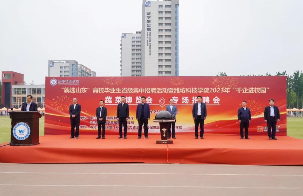 4月22日上午,“就选山东”高校毕业生省级集中招聘活动暨潍坊科技学院2023年“千企进校园”蔬菜博览会专场招聘会在我校北体育场顺利举行。山东省公共就业和人才服务中心就业服务处副处长李吉祥、科长王奇伟,潍坊市公共就业和人才服务中心科长苏明,潍坊科技学院校长、党委副书记魏华中,寿光市人才发展服务中心主任李效宪,寿光市公共就业和人才服务中心主任王伟,寿光市人才发展集团董事长刘子兴,潍坊科技学院党委委员、副校长杨专志出席开幕式,副校长刘相法主持开幕式。