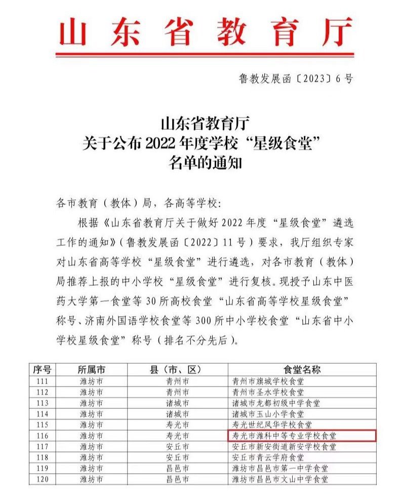 近日,山东省教育厅下发通知公布2022年度山东省学校“星级食堂”名单,我校中专部餐厅荣获“山东省学校星级食堂”称号。