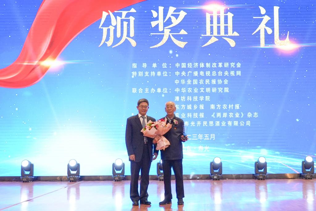 全国优秀共产党员、全国劳动模范、山东省寿光市孙家集街道三元朱村党支部书记王乐义获得首届“贾思勰农业奖”终身成就奖。黄秉信司长为王乐义书记颁奖。
