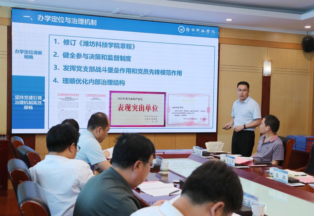 专家组组长、潍坊学院副校长王成端教授介绍进校调研督导安排,并听取我校教务处处长张志军作关于我校应用型本科高校建设情况汇报。张志军从办学定位与治理机制、产教融合、师资队伍、教学资源、人才培养、学生发展、科研与社会服务、文化传承与创新等方面介绍了我校近年来应用型本科高校建设工作。