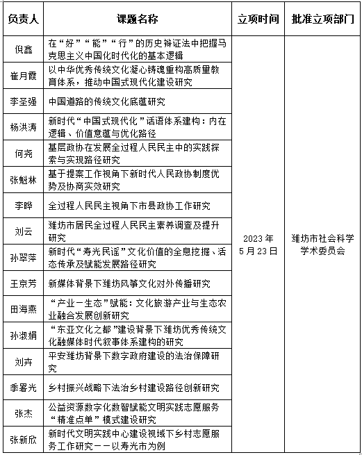 在近日公布的2023年度潍坊市社会科学规划重点研究课题专项课题立项名单中,我校16项课题获准立项。