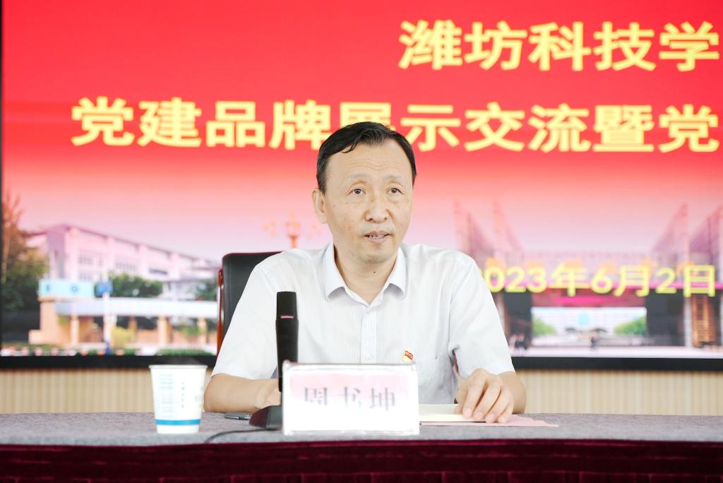 会上,潍坊市委教育工委副书记、市教育局党组成员周书坤作了讲话。周书记首先对省委教育工委一直以来对潍坊市教育系统党建工作的支持和厚爱表示了衷心感谢。他指出,潍坊科技学院长期以来在不断加强党建标准化规范化建设的基础上,致力于党建工作探索创新。学校“五风一体”推动作风建设的模式,以及护理学院党支部“党团共建 阳光护理”等党建品牌能够找准切入点,探索出将党建与业务深度融合的新路径、新机制,印证了“党建强则业务强,党建好则发展好”这一基本的实践逻辑。他强调,当前最重要的任务就是要及时认真地学习习近平总书记在中共中央政治局第五次集体学习上的重要讲话精神,深刻把握讲话中的任务要求,坚持党对教育事业的全面领导,落实立德树人根本任务,牢记为党育人、为国育才使命,坚持党建引领,用习近平新时代中国特色社会主义思想铸魂育人,切实提高办学育人质量。