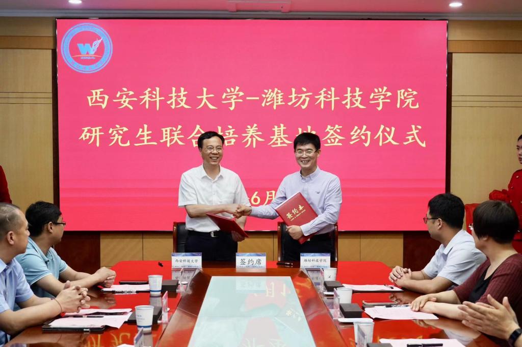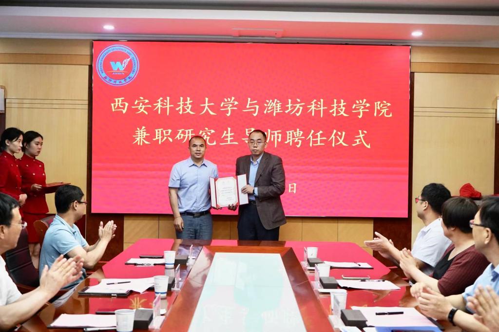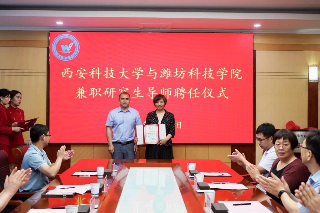 6月19日下午,潍坊科技学院与西安科技大学共建全日制专业学位研究生联合培养基地签约暨揭牌仪式在办公楼第一会议室举行。西安科技大学副校长王贵荣、西安科技大学材料学院院长张涛、西安科技大学研究生院副院长屈孟男、西安科技大学材料学院副院长杨庆浩,我校校长、党委副书记魏华中,党委委员、副校长张友祥,校务委员、人事处处长潘鲲,相关二级学院的院长、书记及兼职硕士生导师参加会议。张友祥副校长主持签约仪式。
