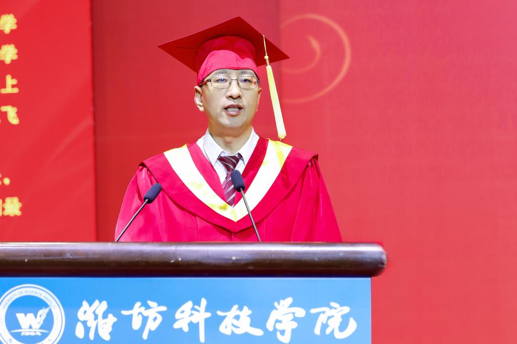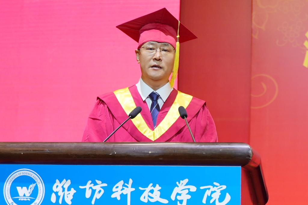 魏华中校长代表校务委员会发表《奋斗致远,不负盛世》致辞,真诚地表达对同学们的祝愿、感谢、希望与不舍。一是送上美好的祝愿。魏校长首先祝贺同学们顺利完成大学学业,带着更加独立的思想、足够丰厚的学识、足以担当的自信,从潍科校园从容启航,奔赴人生新的旅程!大学毕业,同学们将面临生活和生存的若干选择。无论选择一路坦途、步履轻盈,还是繁华喧嚣、人间烟火,生活的路上都不会一直有鲜花和掌声。要始终保持奋发向上的姿态,以进取之心珍惜韶华,以实干之心起而行之,以奋斗之心创造奇迹,努力去到人生更高更远的地方,活出青春应有的模样。二是表达真诚的感谢。魏校长真诚感谢同学们,在求学时选择了潍科;在求学中面对一次次疫情大考,选择直面困难,与学校同心同行,携手度过了甘苦与共的特殊岁月。感谢同学们在“疫”声令下后,选择坚守与信任;在“疫”码当先下,选择理解与支持;在“疫”如既往时,展现出了潍科学子的责任与担当。三是送出衷心的希望。魏校长希望同学们虽然从学校毕业,但永远不要从学习中毕业。有好习惯傍身、有学习力加持,保持一如既往的定力,拥有坚定执着的信念,凡事善作善成,不达目的不罢休,这些是成功路上的“标配”。惟愿同学们于千万人中遇见最想遇见的人,于时间的无涯中看到最美的风景!四是表示深深的不舍。无论同学们今后飞得多高多远,母校会永远攥紧手中牵挂的线,做大家坚强的后盾。二十年后再相会,无论同学们身在何处,从事何种职业,母校依然是你温馨的家园!多少年以后,令你念念不忘的,依然是回忆中那些朝夕相处的师友;令你魂牵梦系的,依旧是记忆里那座温暖的潍科园。
