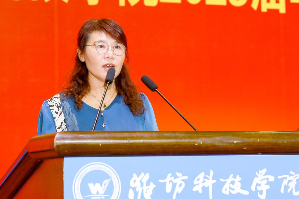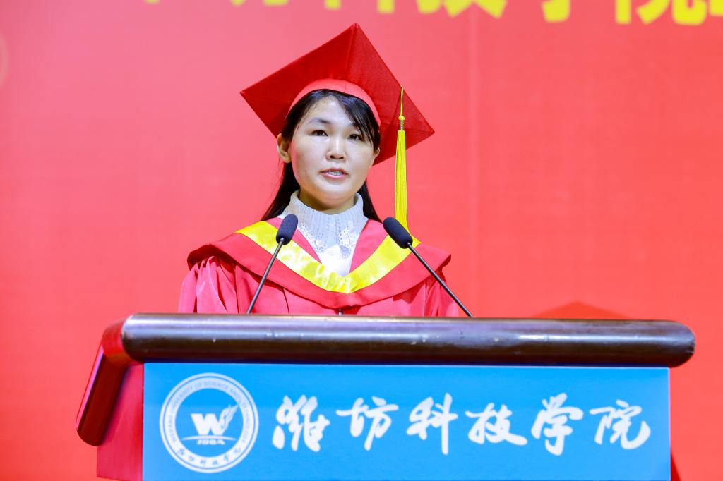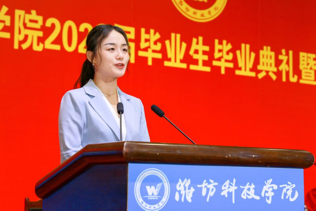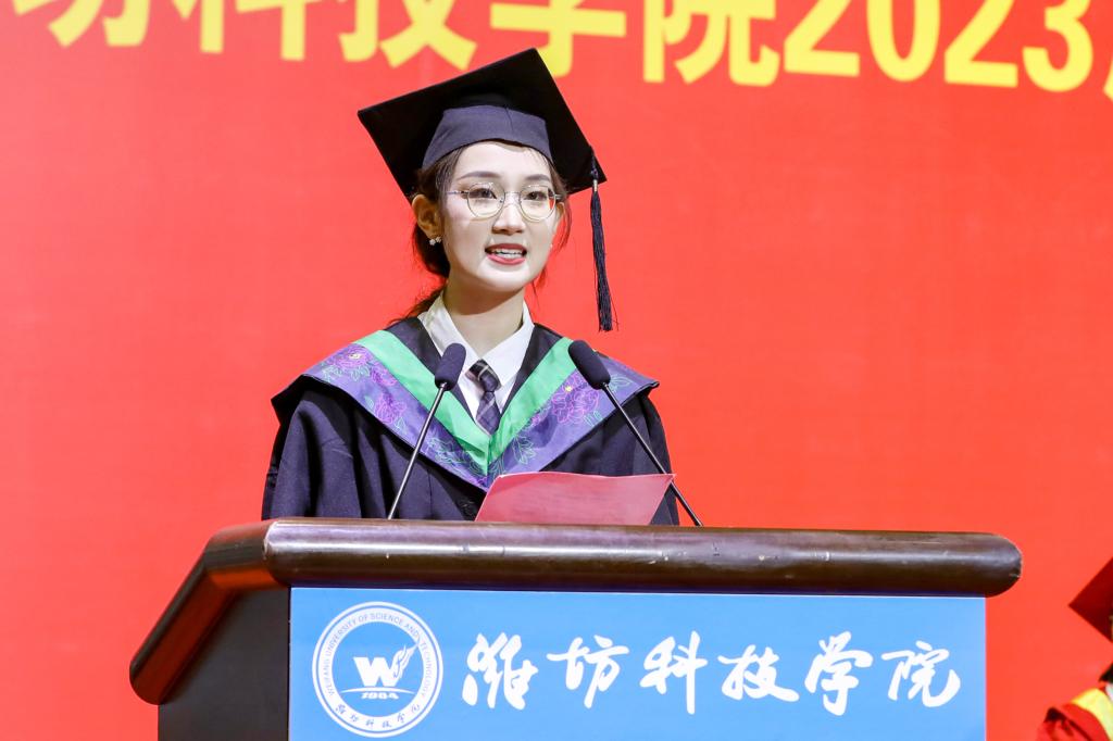 毕业生代表、贾思勰农学院孙勤琳同学向母校和老师的悉心教导和精心栽培表达感谢,将牢记“修身、博学、求索、笃行”的校训,永远不会忘记自己是一名骄傲的潍科人。