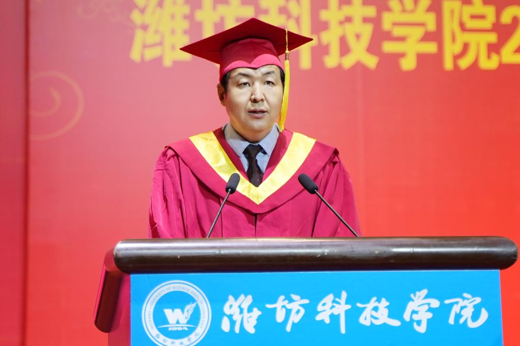 党委委员、副校长李广伟宣读《潍坊科技学院关于为2023届合格毕业生颁发毕业证书的决定》《潍坊科技学院关于授予2023届本科毕业生学士学位的决定》。