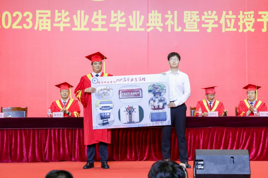 党委委员、副校长付生为2023届毕业生代表颁发校友联络员聘书并代表学校接受毕业生赠送母校纪念品。