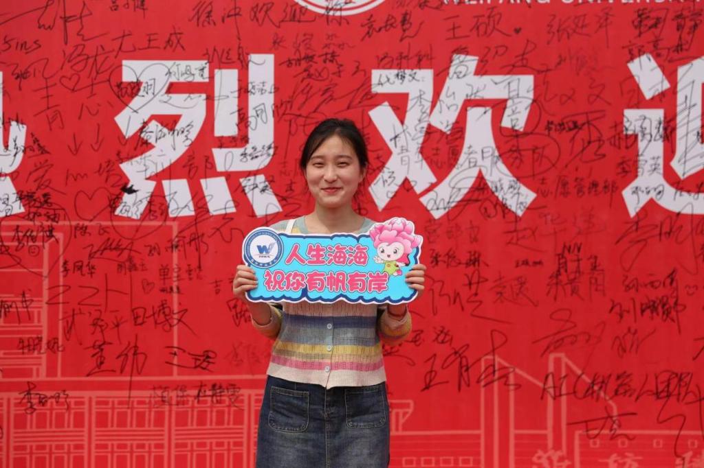 学校在潍坊火车站、潍坊汽车站、寿光汽车站均设有新生接站车,还在办公楼前设立了新生报到留影打卡墙,为家长和学生拍照留念,希望这些照片能成为潍科与同学和家长共同的回忆。