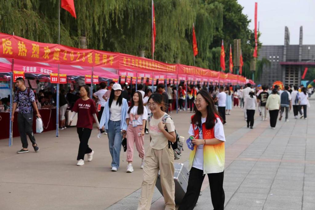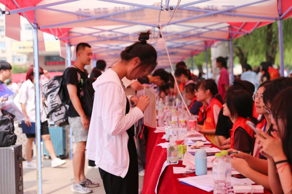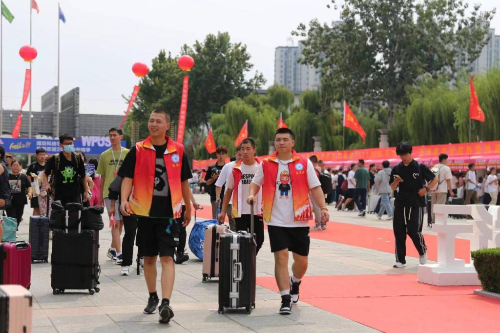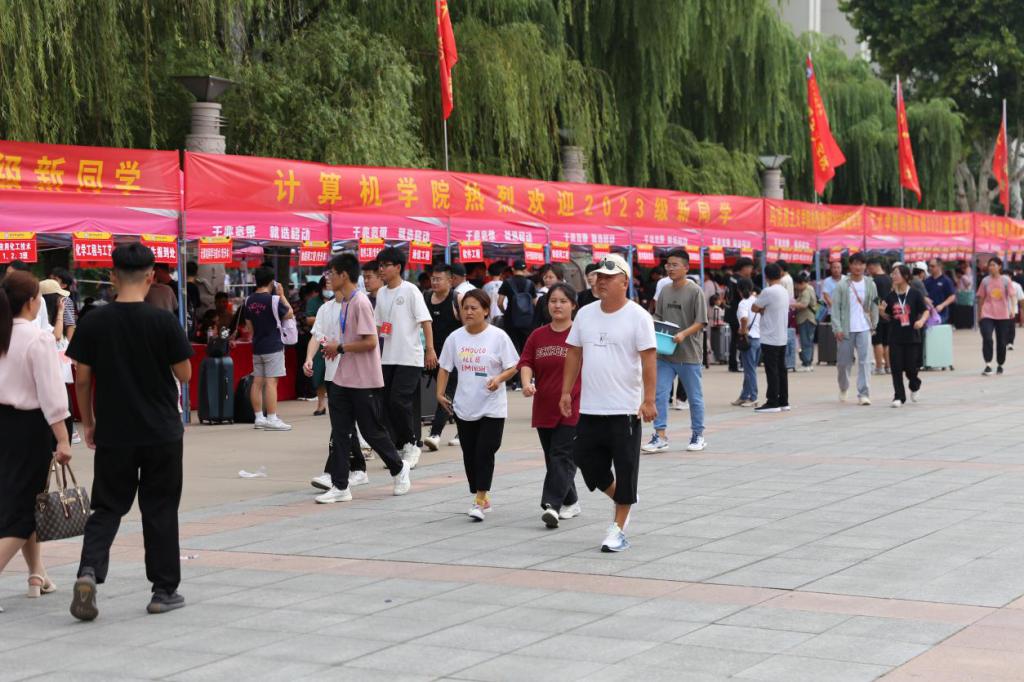 各院系在办公楼前孔子广场设立了迎新点,每个迎新点安排专人为新生办理报到手续,并准备了迎新标语、气球及横幅等。同时为保证远道而来的家长得到更好的休息,学校在南门设置了家长休息区。