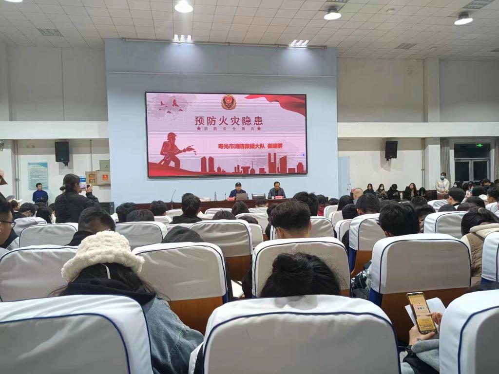 11月9日,学校组织开展119消防宣传教育集中宣讲活动,寿光市消防大队宣传科科长王蕊、队员崔建群同志,安全保卫处全体人员、各二级学院安全员老师和学生代表600多人参加。崔建群讲解了与学生息息相关的消防安全知识,包括在宿舍日常生活中应注意的问题、发生火灾如何逃生、拨打报警电话时注意的问题以及拨打报警电话后应该做的事情,现场向同学们讲述了两种灭火工具的使用方法,用实际行动杜绝火灾。