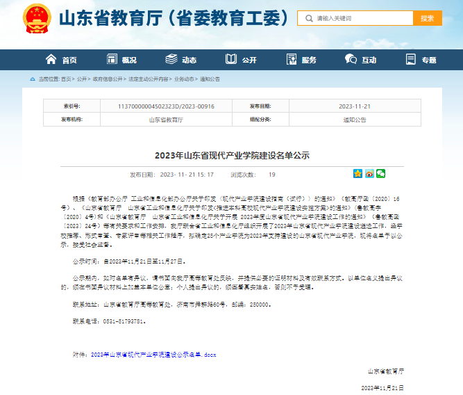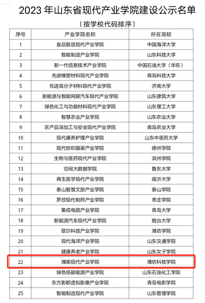 11月21日,山东省教育厅网站发布2023年山东省现代产业学院建设名单公示,我校潍柴现代产业学院获批山东省现代产业学院建设单位,学校深化产教融合取得新突破。
