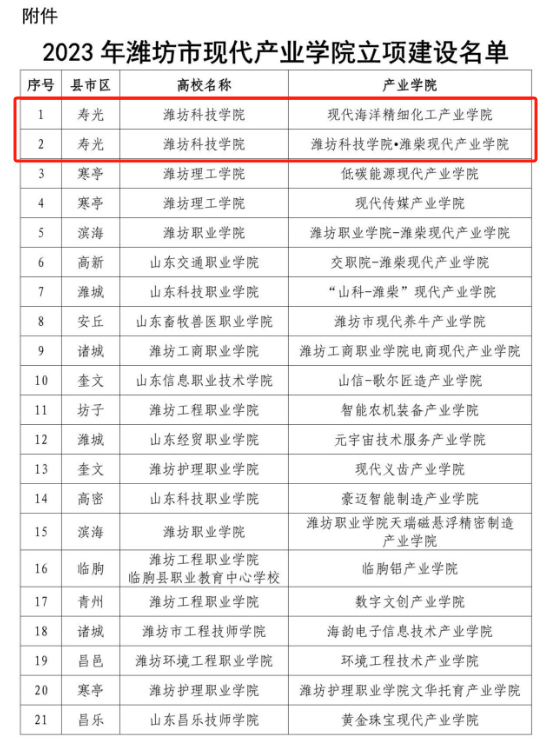 11月21日,潍坊市现代产业学院工作专班发布《关于公布2023年潍坊市现代产业学院立项建设名单的通知》,我校潍柴现代产业学院、现代海洋精细化工产业学院获批潍坊市现代产业学院立项建设单位,我校深化产教融合、深入推进校企合作取得新突破。