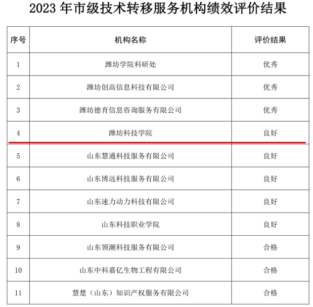 近日,潍坊科技局公布了2023年潍坊市级技术转移服务机构绩效评价结果,全潍坊市共有11家单位备案后进行绩效评价,潍坊科技学院在绩效评估中获得良好成绩。