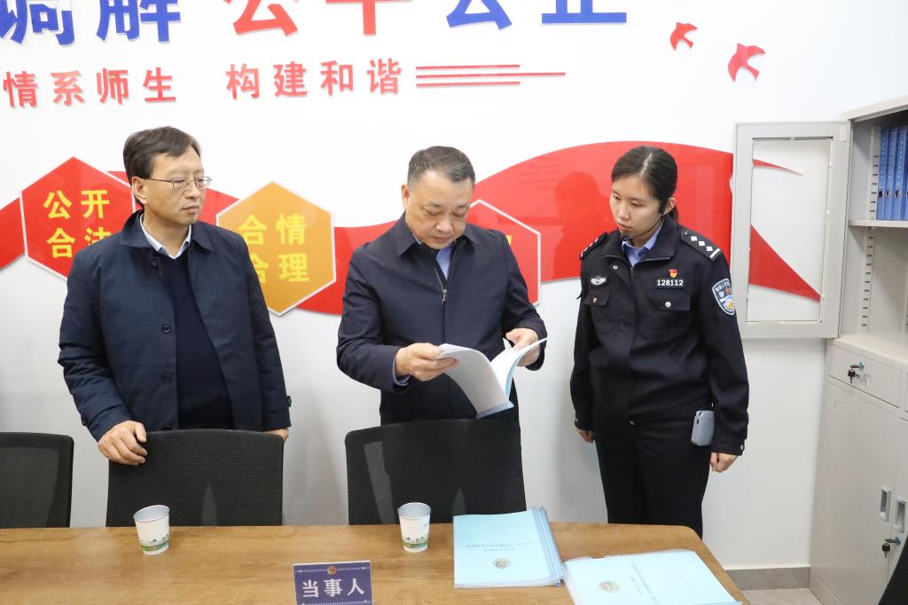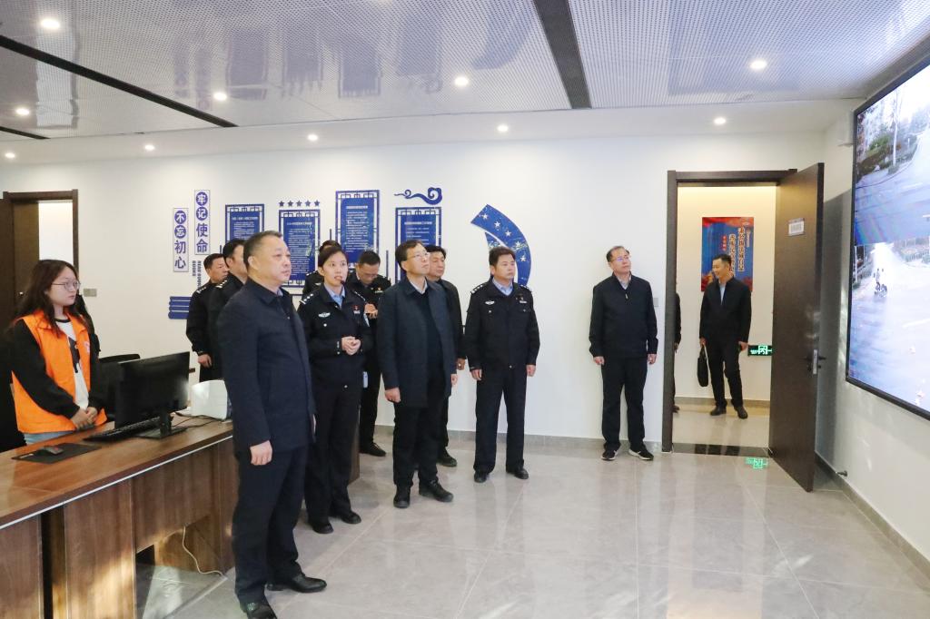 姬洪刚一行查看了我校警务室建设和运行情况,在警务室民警的介绍下详细了解了调解室、多警种办公室、安全体验室、指挥中心、新媒体中心、宣讲室等内部安保设施及人员配置落实情况。姬洪刚对我校警务室建设和运行情况给予高度评价,同时对警务室下一步的工作进行了现场调度。