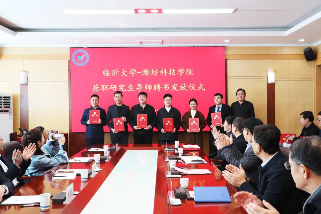 12月27日上午,临沂大学和潍坊科技学院省级研究生联合培养基地建设启动暨临沂大学兼职硕导聘任仪式在我校办公楼第一会议室举行。临沂大学党委书记王焕良,党委办公室、校长办公室主任杨洪杰,研究生处(学科建设办公室)处长(主任)付厚利,研究生处副处长胡晓丽,研究生处学位办主任房永彬,研究生处教学秘书魏田升,潍坊科技学院校长、党委副书记魏华中,党委书记赵光强,党委委员、副校长张友祥,校务委员会成员、人事处处长潘鲲,发展规划处处长兼学科办主任马文军,计算机学院院长王学伟及部分兼职硕导代表出席仪式。张友祥副校长主持启动仪式。