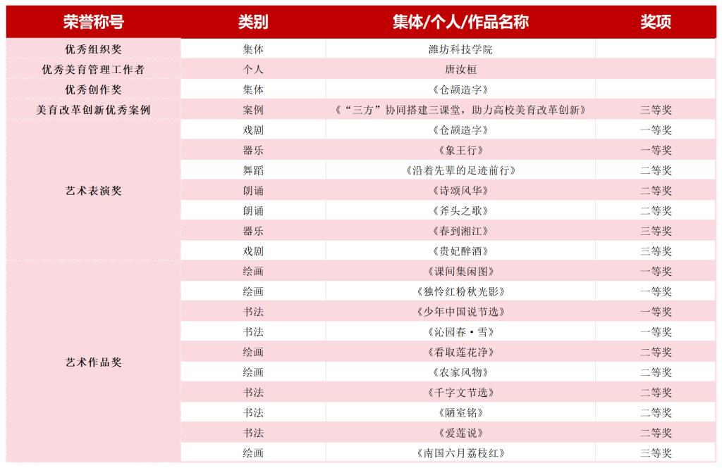 我校自2023年5月启动此次展演活动筹备组织工作,学校领导高度重视,多方筹措资源,全程强化指导,团委牵头组织全校师生踊跃参与,最终提报18件艺术作品参与此次展演展评活动。其中,原创戏剧《仓颉造字》以甲组集体项目第一名的成绩斩获一等奖,并获得“优秀创作奖”;器乐小合奏《象王行》获“艺术表演一等奖”,另有原创红色舞蹈《沿着先辈的足迹前行》、集体朗诵《诗颂风华》和个人朗诵《斧头之歌》斩获“艺术表演二等奖”,器乐独奏《春到湘江》和戏曲《贵妃醉酒》获“艺术表演三等奖”;《绘画作品《课间集闲图》、《独怜红粉秋光影》及书法作品《少年中国说节选》、《沁园春·雪》纷纷斩获“艺术作品一等奖”,另有5项书画作品获“二等奖”,1项获“三等奖”;报送的高校学生艺术社团及实践工作坊建设案例《“三方”协同搭建三课堂,助力高校美育改革创新》获“高校美育改革创新优秀案例三等奖”。以上获奖作品集中体现了我校近年来专业教学的高质量成果和美育育人工作的卓越成效。
