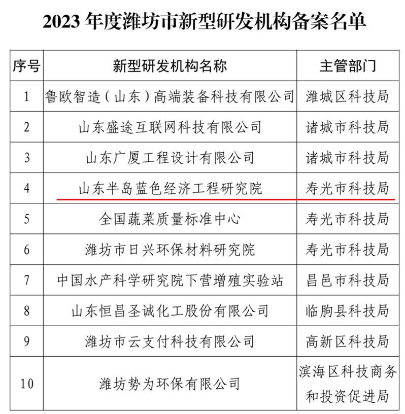 近日,潍坊科技局公布了2023年潍坊市新型研发机构备案名单,我校山东半岛蓝色经济工程研究院获评潍坊市新型研发机构备案,本次备案全市共有10家单位入围。