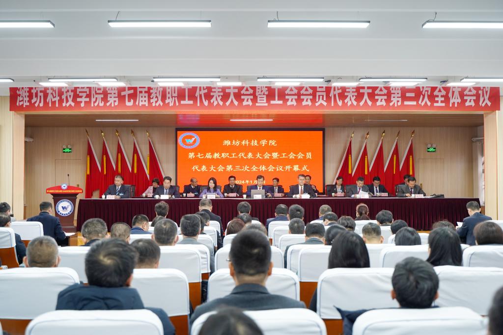 1月9日上午,潍坊科技学院第七届教职工代表大会暨工会会员代表大会第三次会议在办公楼六楼会议室召开。潍坊科技学院校长、党委副书记魏华中,党委书记赵光强,校级领导班子成员在主席台就座。党委书记赵光强致开幕词。党委委员、副校长杨专志主持会议。