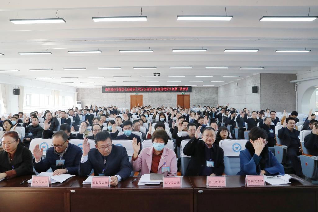 本次教代会共收到教育教学、学生管理、科学研究、科研资源整合、师资队伍建设、信息化管理等方面提案19项,经合并为16项,收到教代会拟通过的办法相关建议意见6项,魏华中校长对代表提出的议案及意见建议进行了逐一解答。会上,代表们审议通过了《潍坊科技学院第七届三次教代会工作报告》《潍坊科技学院工会委员会第七届三次会员代表大会工作报告》《潍坊科技学院2023年度财务工作报告》《潍坊科技学院科研促进教学工作管理办法(讨论稿)》《潍坊科技学院人才引育与管理办法》等规章制度。