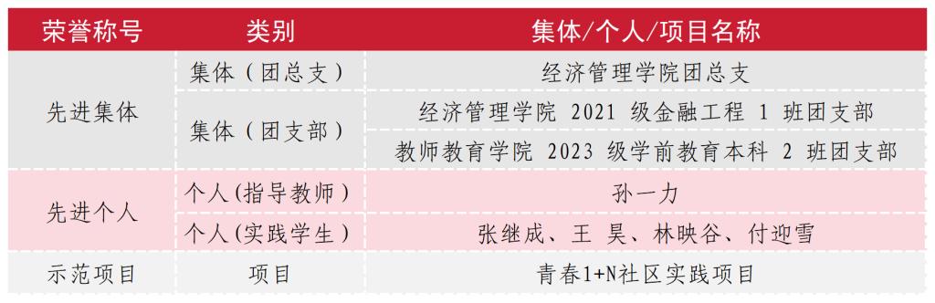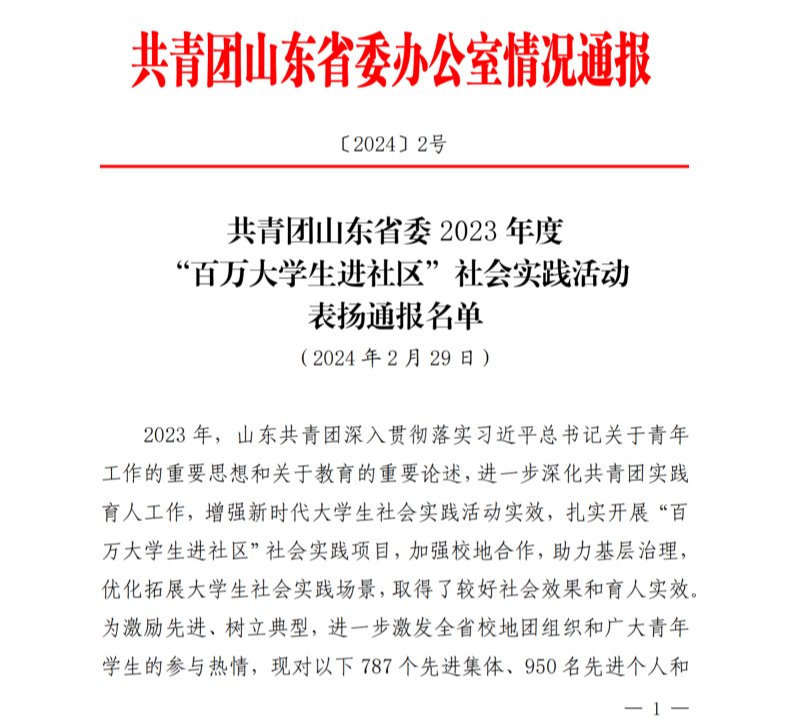 近日,共青团山东省委对在2023年度“百万大学生进社区”社会实践活动中表现突出的集体、个人和示范项目进行通报表扬。其中我校3个集体荣获“先进集体”,5名师生获评“先进个人”,“青春1+N”社区实践项目获评“示范项目”。