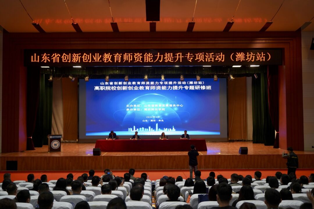 4月8日上午,由山东省教育发展服务中心主办、潍坊科技学院承办的山东省高校创新创业教育师资能力提升专题研修班(潍坊站)在潍坊科技学院国际会议中心顺利举办。山东省教育发展服务中心党委委员、副主任孙培东,山东省教育发展服务中心创新创业部副部长王进,我校党委委员、副校长李广伟及来自全省83所高校的500多位教师参加开班仪式。我校宣传部常务副部长兼马克思主义学院院长、创新创业学院院长杜鹏主持。