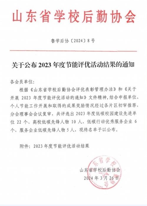 近日,山东省后勤协会、山东省机关事务管理局公布2023年度低碳校园建设先进单位名单22家,我校位列其中。