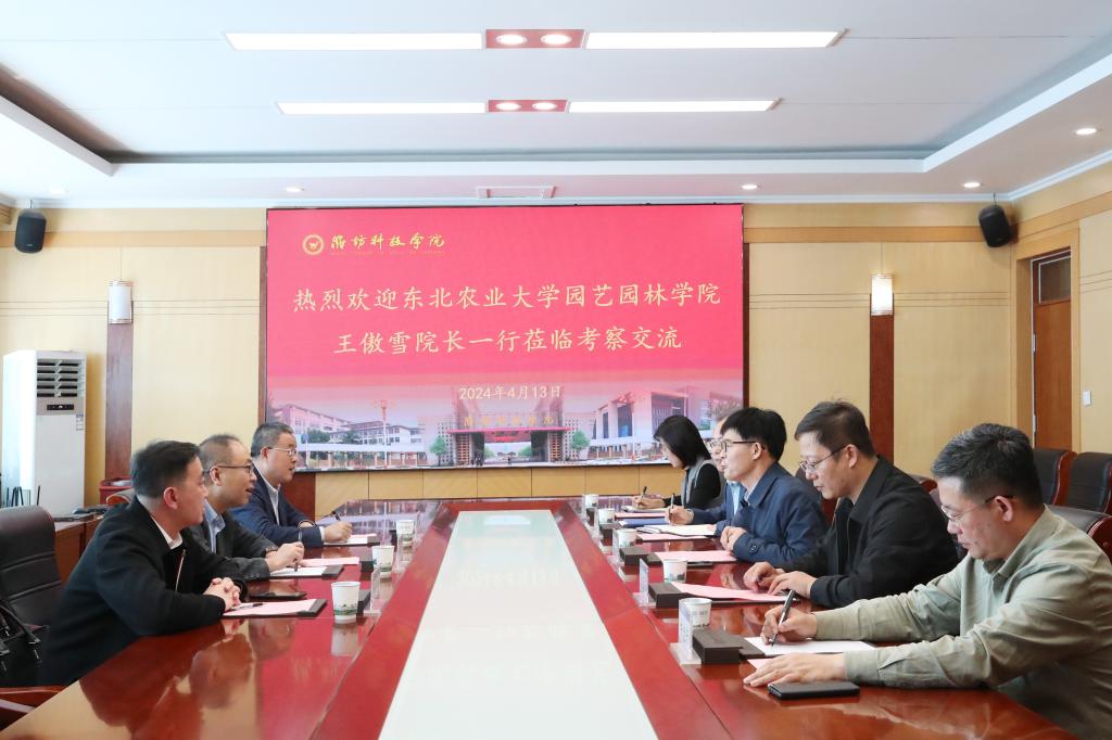 4月13日下午,东北农业大学园艺园林学院院长王傲雪一行到我校考察交流。学院党委委员、副校长张友祥,科研处、社会服务处、贾思勰农学院等相关部门负责人参加座谈。