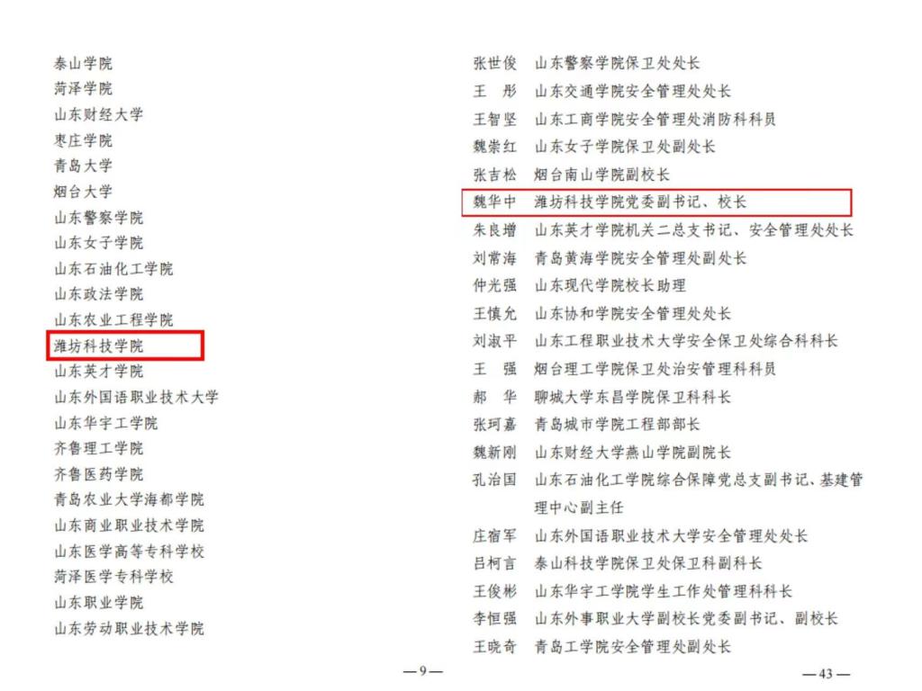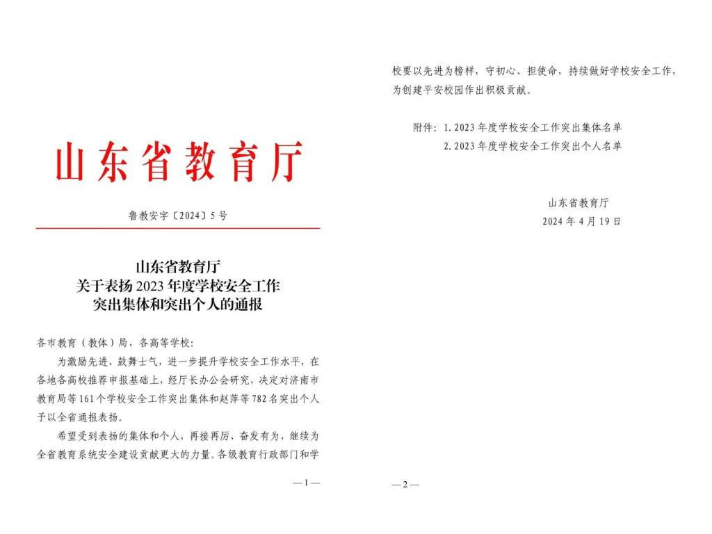 近日,山东省教育厅下发《山东省教育厅关于表扬2023年度学校安全工作表现突出集体和突出个人的通报》(鲁教安字〔2024〕5号),我校被评为“2023年度学校安全工作突出集体”,我校校长、党委副书记魏华中被评为“2023 年度学校安全工作突出个人”。