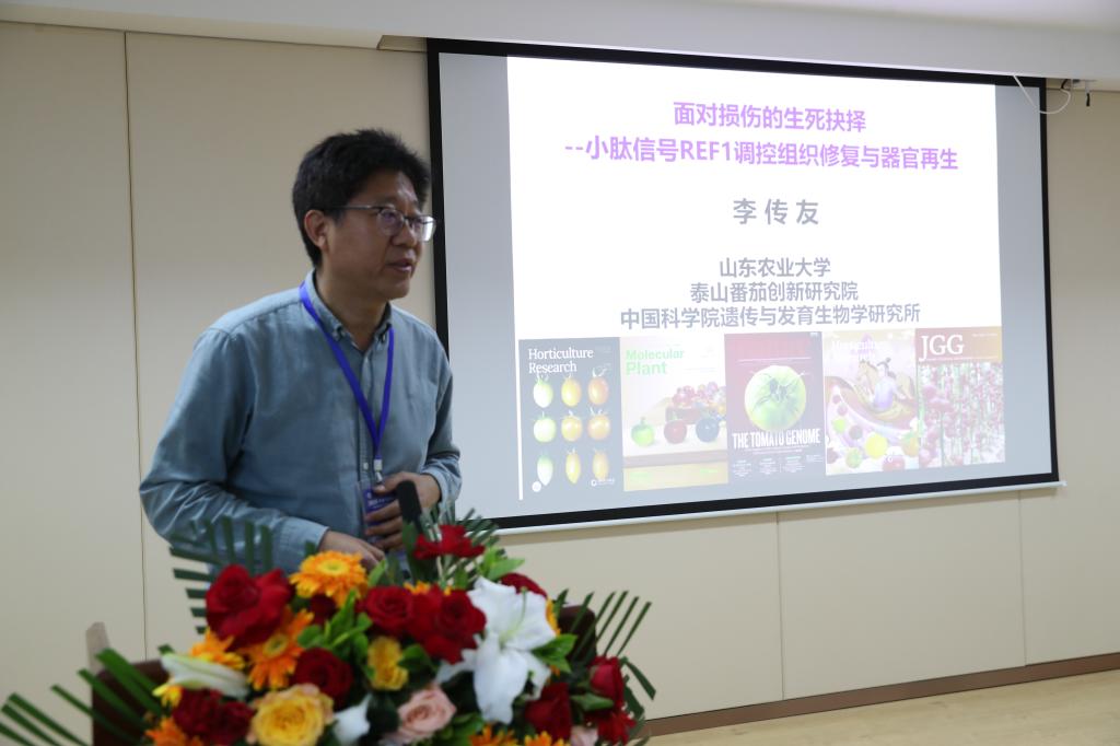 山东农业大学生命科学学院院长、中国科学院遗传与发育生物学研究所研究员李传友作《面对损伤的生死抉择——小肽信号REF1调控组织修复与器官再生》报告;