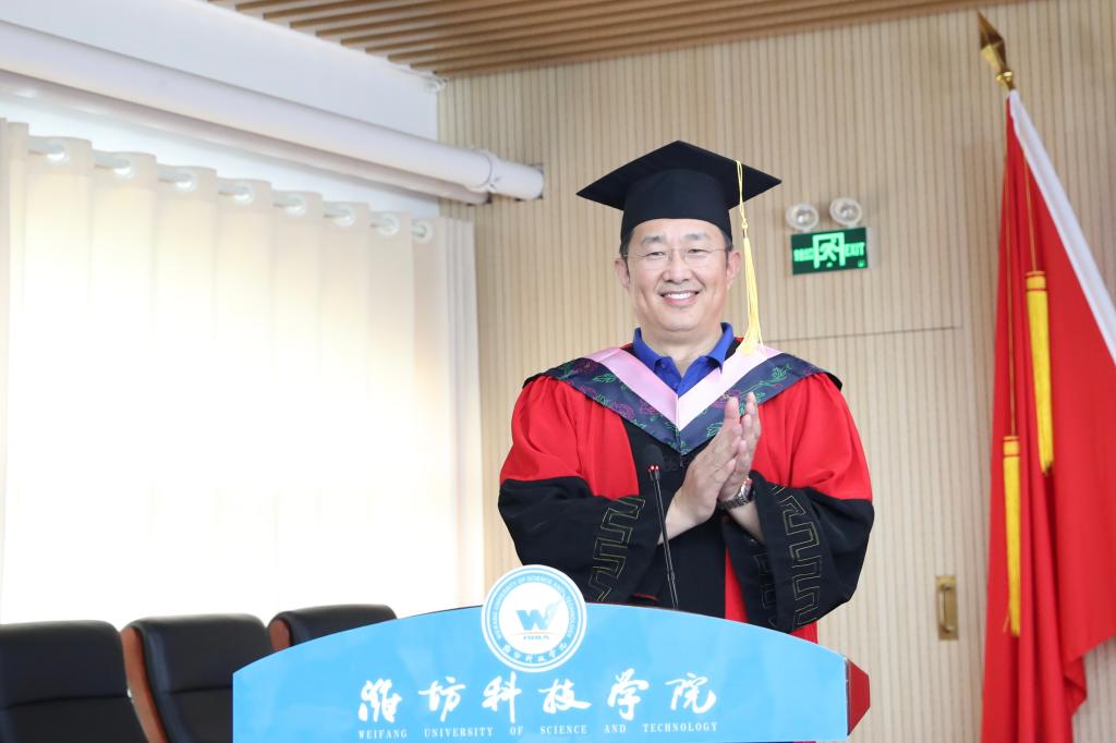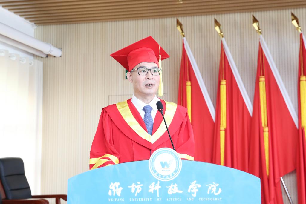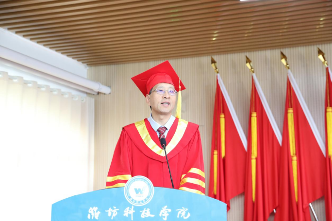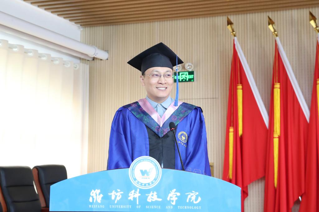 毕业生代表李洪基在发言中表达了对两所学校的深深感激,分享了自己在职攻读MBA硕士学位的挑战与收获,并代表同学们向东北师范大学和潍坊科技学院表达了对未来的期待和承诺。