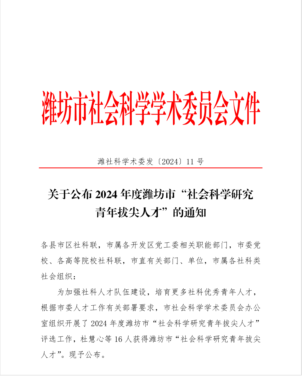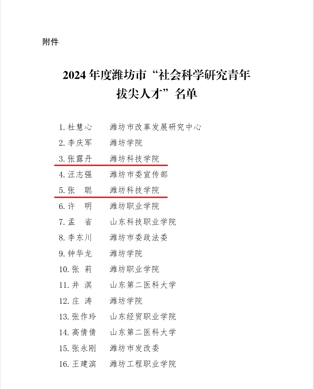 近日,潍坊市社会科学学术委员会发布了《关于公布2024年度潍坊市“社会科学研究青年拔尖人才”的通知》,我校张露丹、张聪两位博士被评为2024年度潍坊市“社会科学研究青年拔尖人才”。