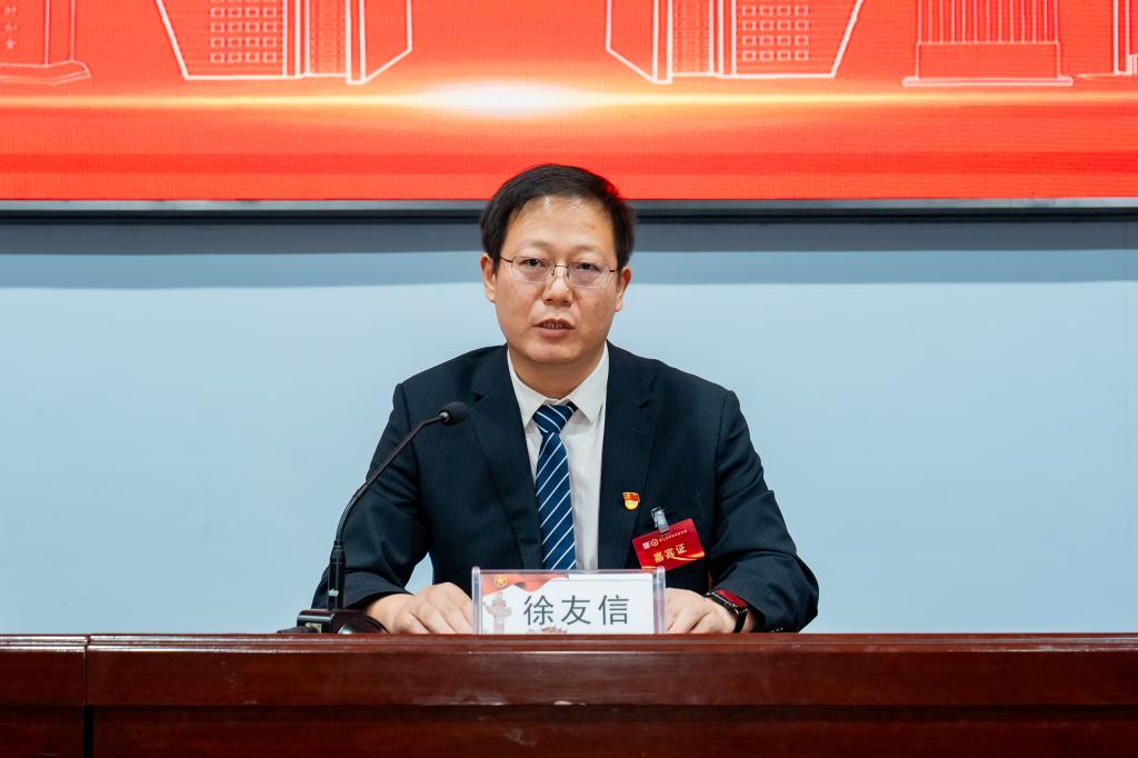 大会在豪迈雄壮的国歌声中拉开序幕。徐友信致开幕辞,他代表校党委向大会的召开表示热烈的祝贺,充分肯定了我校学生会在过去一年取得的突出成绩,对我校学生会改革发展表达了美好祝愿。他表示,本次学代会的召开恰逢学校全力迎接本科审核评估,事业发展“提质增效”的重要时期,他希望把这次大会开成一次求真务实、开拓创新的大会;开成一次统一思想、凝聚力量的大会;开成一次团结带领全校青年学生奋楫笃行、砥砺奋斗的大会。徐友信在讲话中表示,学生会是党领导下、共青团主导的学校团学组织体系的重要组成部分,学校各级学生会组织一是要坚定理想信念,胸怀国之大者,争做“眼有星辰大海”的有志青年;二是要提升综合素质,锤炼过硬本领,争做“胸怀万里山河”的有为青年;三是要勇于挺膺担当,持续砥砺奋进,争做“肩负时代使命”的有责青年。他强调,全体潍科学子要追随信仰之光、扛起历史之责、不负时代之望,在强国复兴的新时代吹响嘹亮的青春号角,在民族复兴的历史进程中书写华丽的青春篇章,在高水平、应用型、品质本科高校建设的新征程中贡献青春力量!