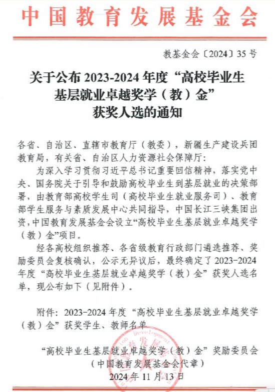 “高校毕业生基层就业卓越奖学(教)金”由教育部高校学生司(高校毕业生就业服务司)、教育部学生服务与素质发展中心共同指导评选,旨在深入学习贯彻习近平总书记重要回信精神,落实党中央、国务院关于引导和鼓励高校毕业生到基层就业的决策部署,奖励赴基层就业创业并作出突出业绩的普通高校毕业生。