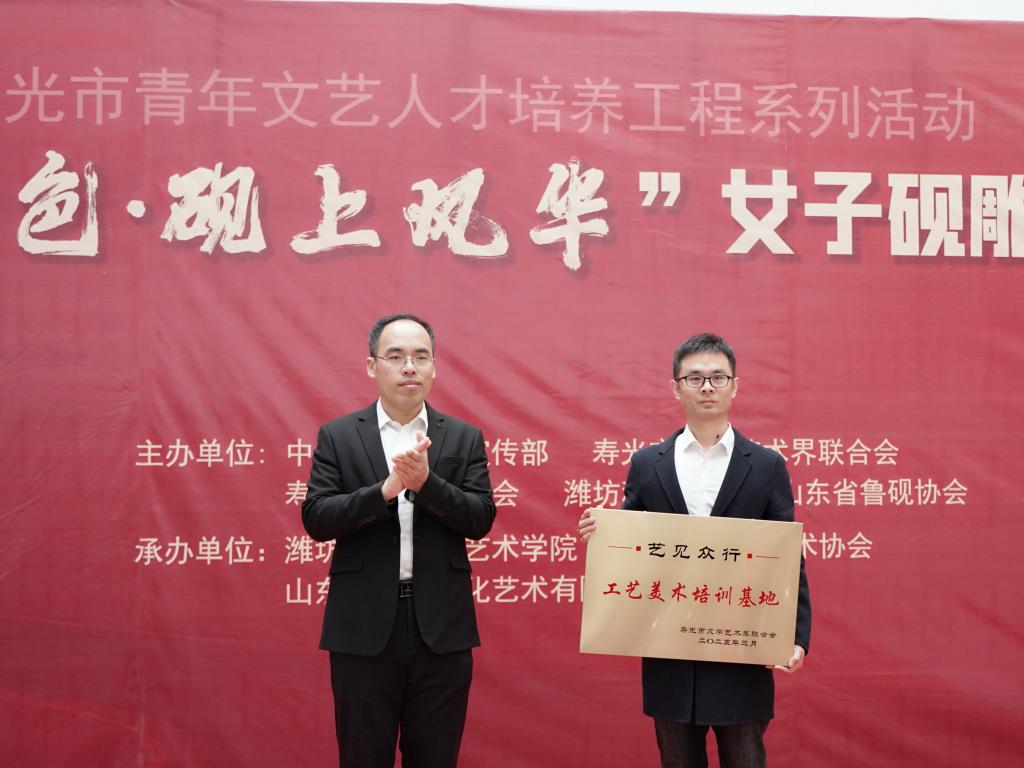 寿光市文联副主席赵德彦向寿光市工艺美术协会会长齐增升授予“寿光市文联‘艺见众行’工艺美术培训基地”牌匾。