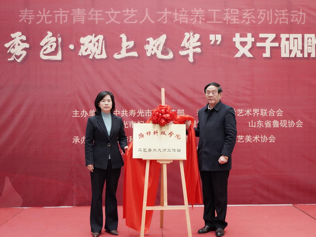 山东省工艺美术协会副会长、潍坊市工艺美术协会党委书记丁传信与寿光市妇联党组书记、主席张林英共同为潍坊科技学院“工艺美术大师工作站”揭牌。