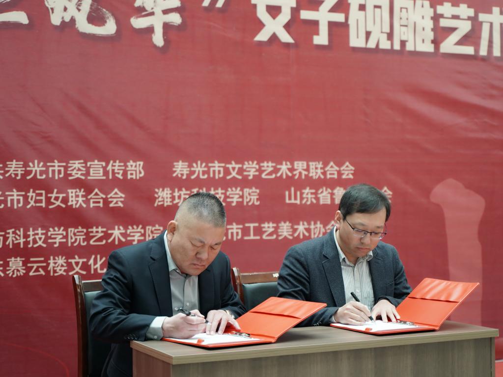 山东省鲁砚协会会长郝元勋与潍坊科技学院艺术学院院长姜亦金就“战略赋能扶持大学生创业就业计划”进行意向书签约,并进行砚台捐赠仪式。