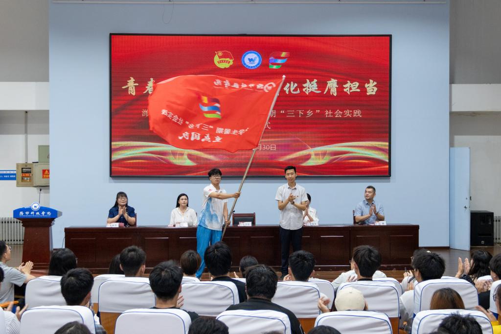 仪式最后,孙宝国为校级重点团队代表授旗。这面旗帜不仅象征着使命的传承,更标志着潍坊科技学院2025年大学生暑期“三下乡”社会实践的征程正式扬帆起航。