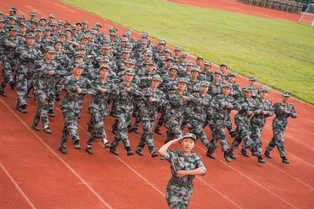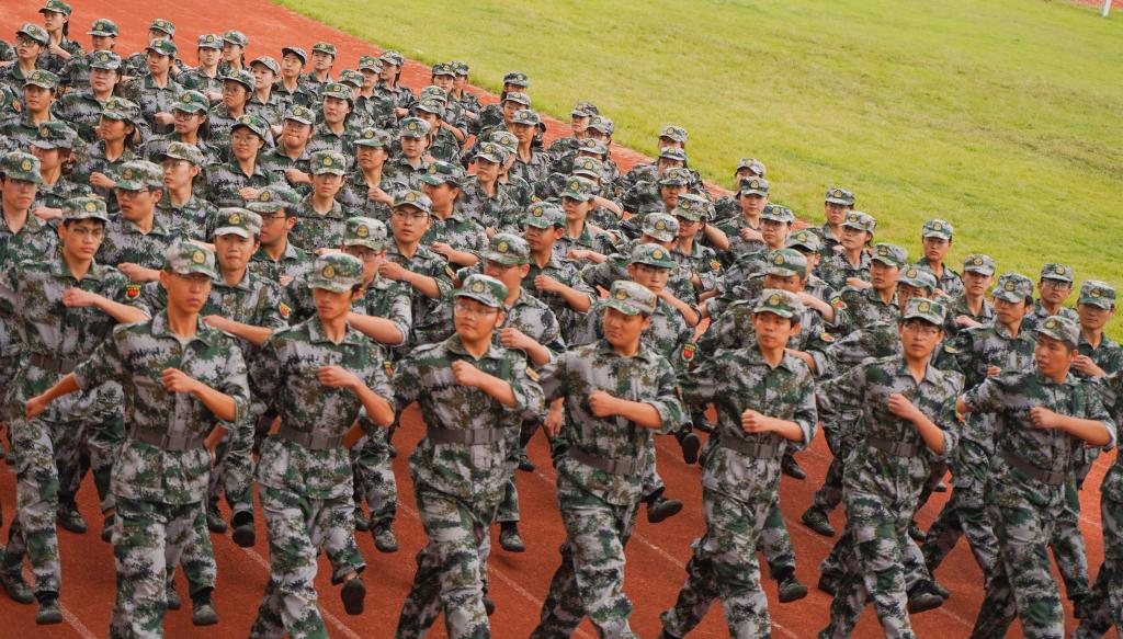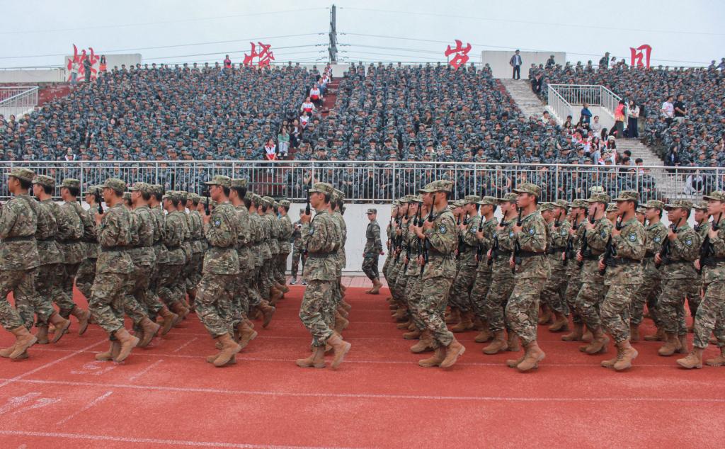 2025级新生以连队为单位依次列队行进。同学们步伐铿锵、精神抖擞,队列严整有序、动作规范统一,将21天军训的扎实成果转化为整齐划一的风采展示,充分展现新时代青年学子的昂扬姿态。