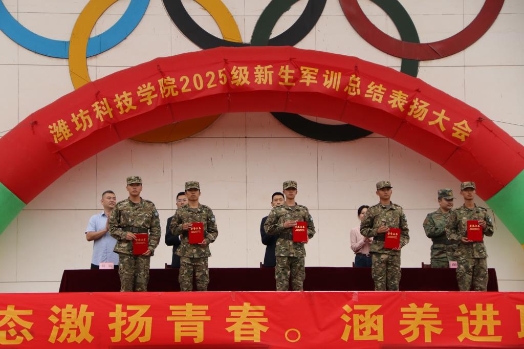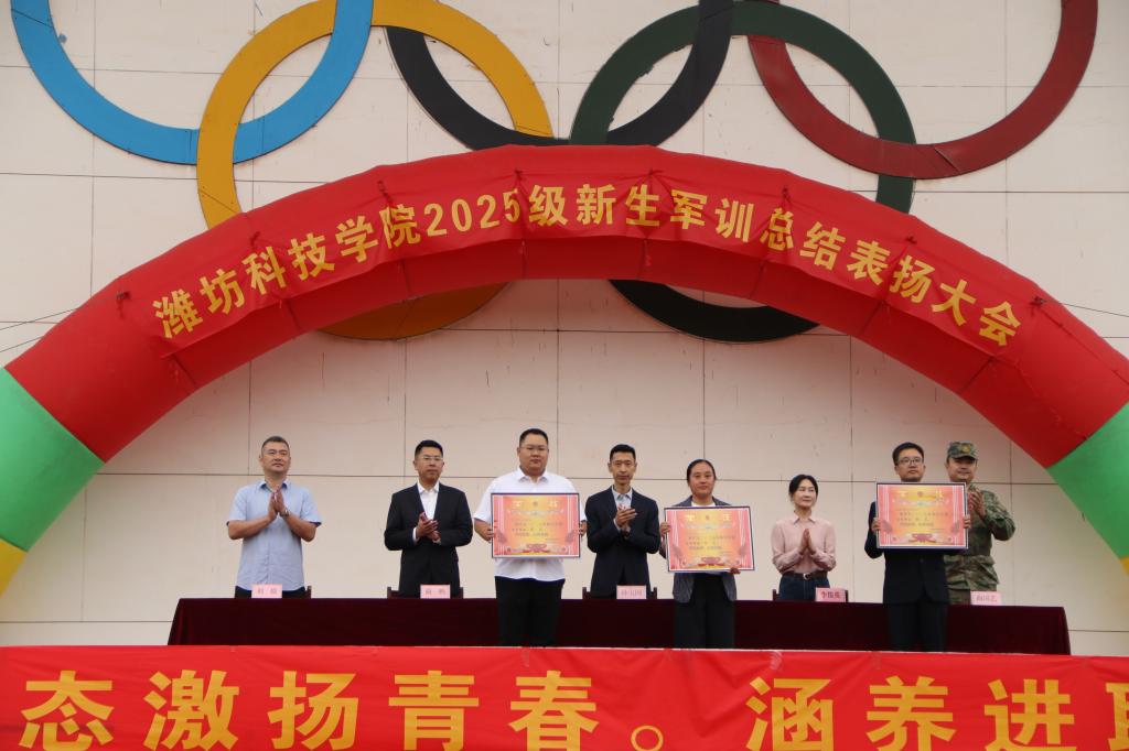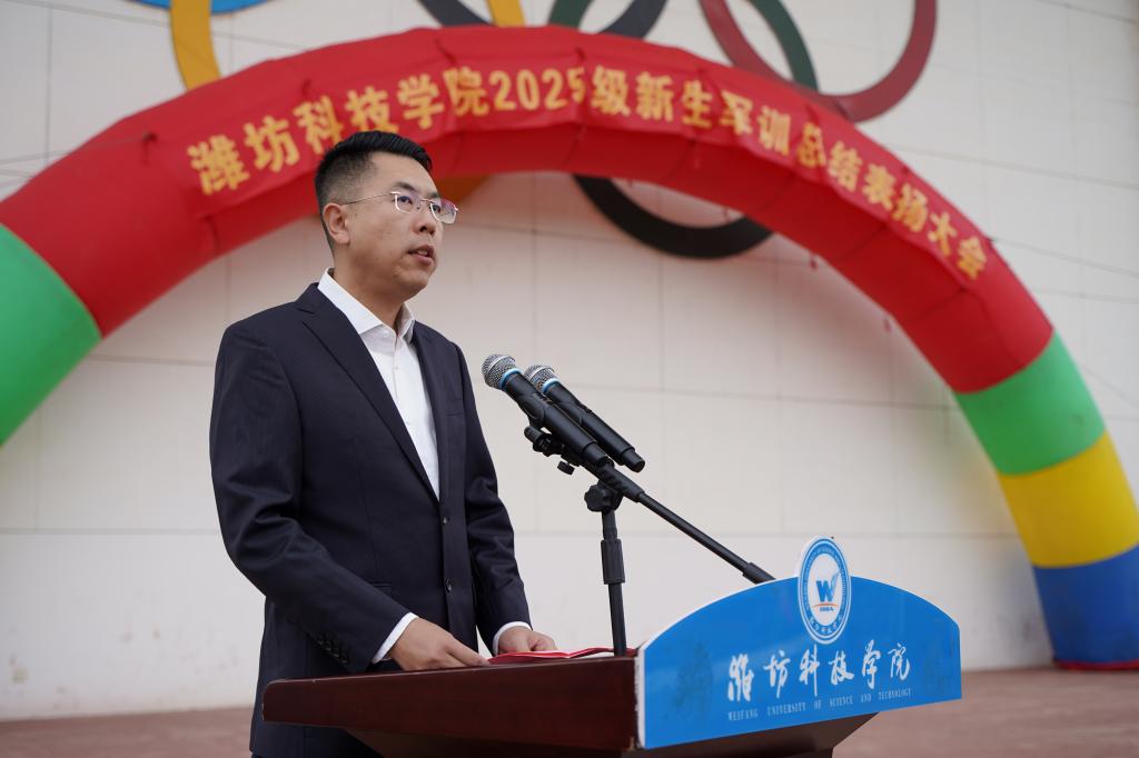 金秋时节结硕果,军训砺炼展锋芒。9月28日,潍坊科技学院2025级新生军训总结表扬大会在西运动场举行。校党委委员、学工处处长孙宝国 ,学工处,团委及各二级学院学生管理干部、辅导员与全体2025级军训学生共5500余人齐聚一堂,共同检阅为期21天的军训成果,表彰先进典型,为新生们的大学第一课画上圆满句号。大会由学工处副处长兼机械与电气工程学院书记蔺鹏主持。