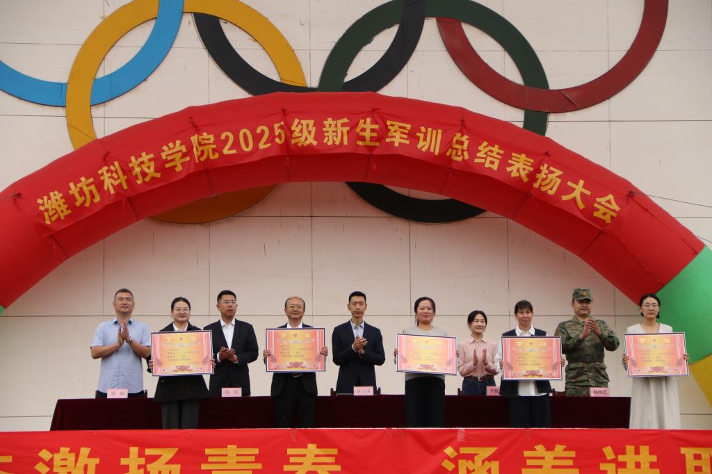 学工部党总支书记李俊英同志宣读《潍坊科技学院关于表扬2025级新生军训先进集体和优秀个人的决定》,对军训期间表现突出的7个“先进单位”、17个“先进连队”、66名“优秀教官”、106名“优秀学员”及各类比赛获奖集体进行表彰,并现场为受表彰代表颁发荣誉证书。