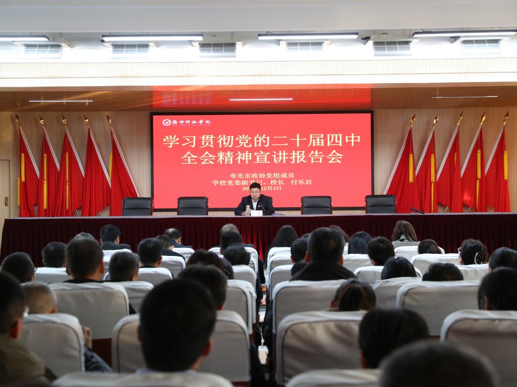 为全面学习贯彻党的二十届四中全会精神,凝聚奋进力量,推动学校事业高质量发展,12月3日下午,寿光市政协党组成员、学校党委副书记、校长付乐启在办公楼六楼报告厅作党的二十届四中全会精神宣讲。全体党员中层干部、党员进党校培训一班学员等200余人参加报告会。