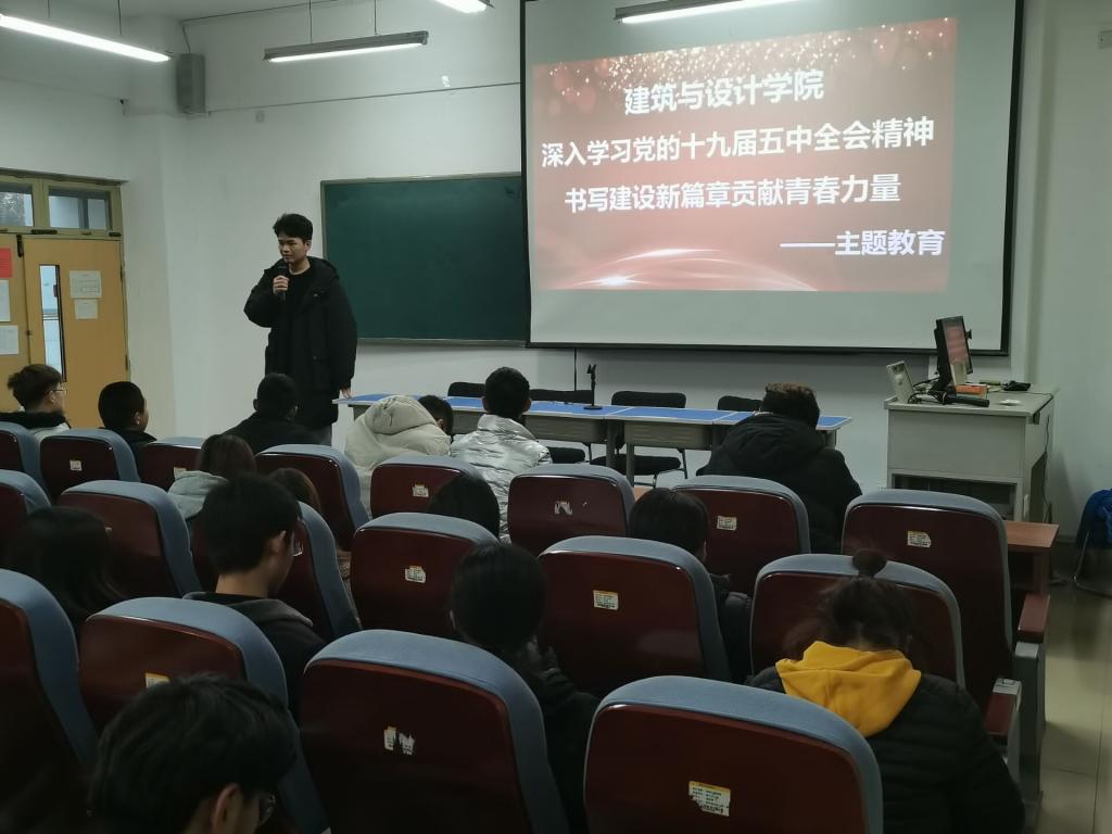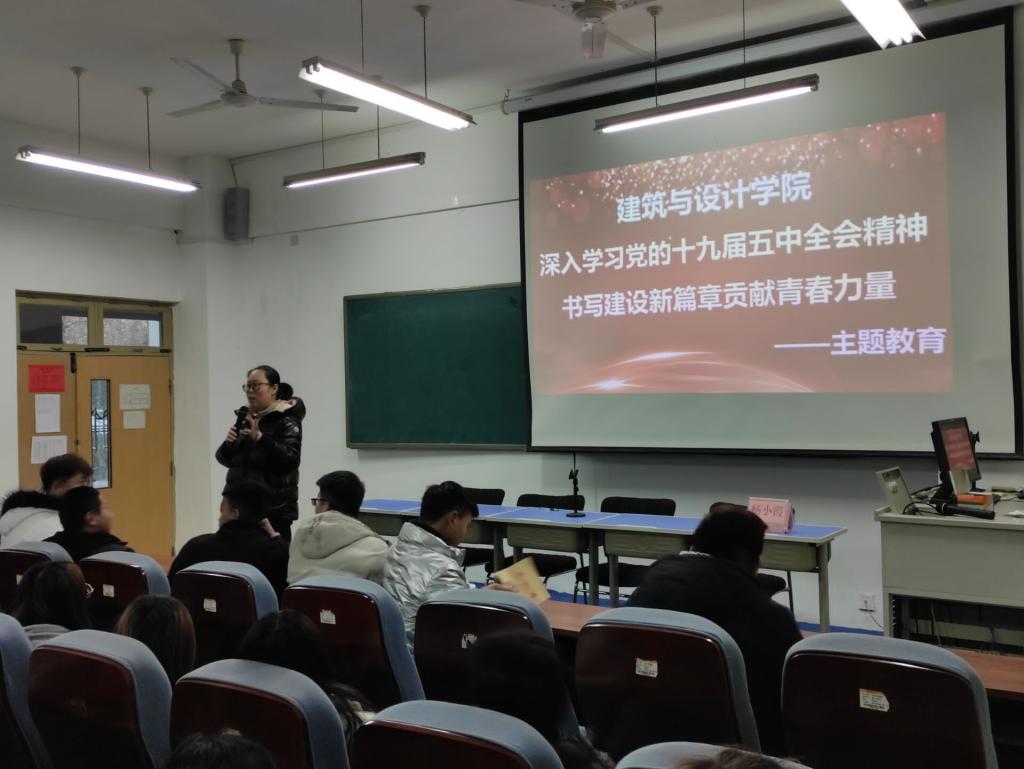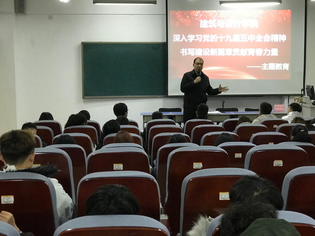 建筑与设计学院党支部书记郭振鹏以“深入学习党的十九届五中全会精神 书写建设新篇章贡献青春力量”为主题,为师生们作了一场精彩的宣讲报告。郭振鹏结合教学管理实际,对全会精神进行了全面宣讲和深入阐释,会议现场座无虚席,气氛热烈。