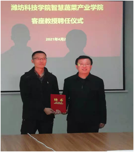 4月2日上午,潍坊科技学院智慧蔬菜产业学院举行客座教授聘任仪式,聘请青岛佳垦农化服务有限公司技术总监、高级农艺师金国良为智慧蔬菜产业学院客座教授,并颁发聘书。
