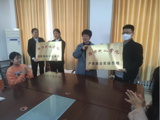 宋继梅、唐玉海分别代表潍坊科技学院农学与化工技术学院、创新创业学院与山东青华园林设计有限公司代表进行产教融合合作签字、授牌。