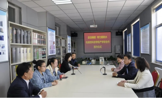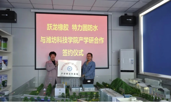 4月17日上午,农学与化工技术学院院长宋继梅、农学与环境学部科研和社会服务中心主任冯丽娟与潍坊市跃龙橡胶有限公司、山东特力固防水材料有限公司负责人在寿光市防水协会二楼运行中心举行产学研合作签约授牌仪式。台头镇党委副书记杨超(挂职),寿光市防水行业协会秘书长郑家玉参加活动。