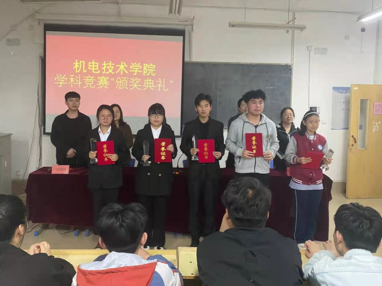 颁奖典礼上,机电系主任朱晓丽宣读了“学科竞赛”获奖名单,受表扬的学生依次上台领奖。优秀学生代表高亚慧发言,她跟同学们分享了自己的学习经验,鼓励大家积极参与到学科竞赛中,为将来的发展打下坚实基础。