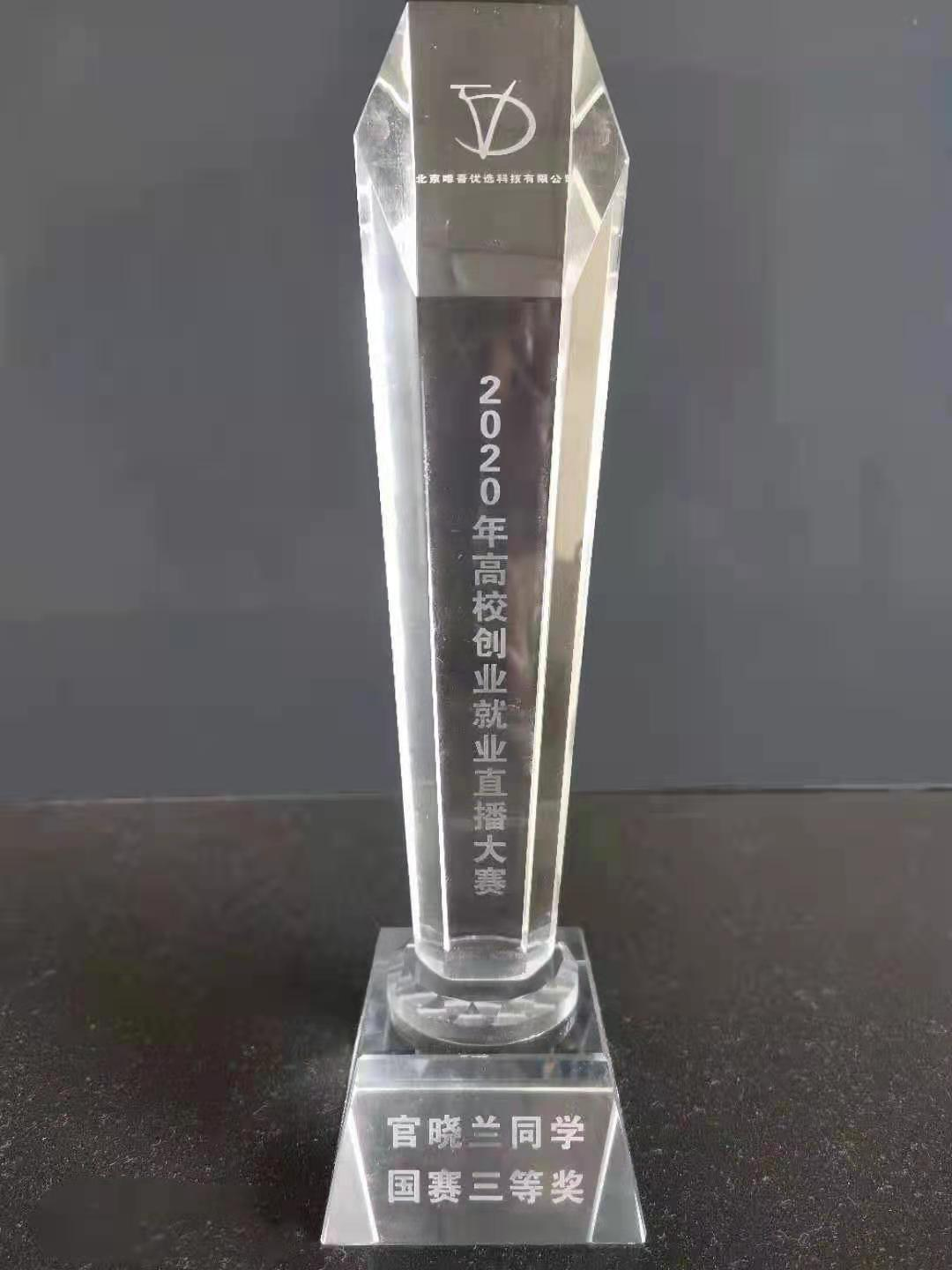 近日,“2020年高校创业就业直播大赛”圆满结束,我校通识学院官晓兰同学在比赛中表现优异、贡献突出,荣获全国总决赛三等奖;指导教师范福强、张公卿获最佳组织奖。